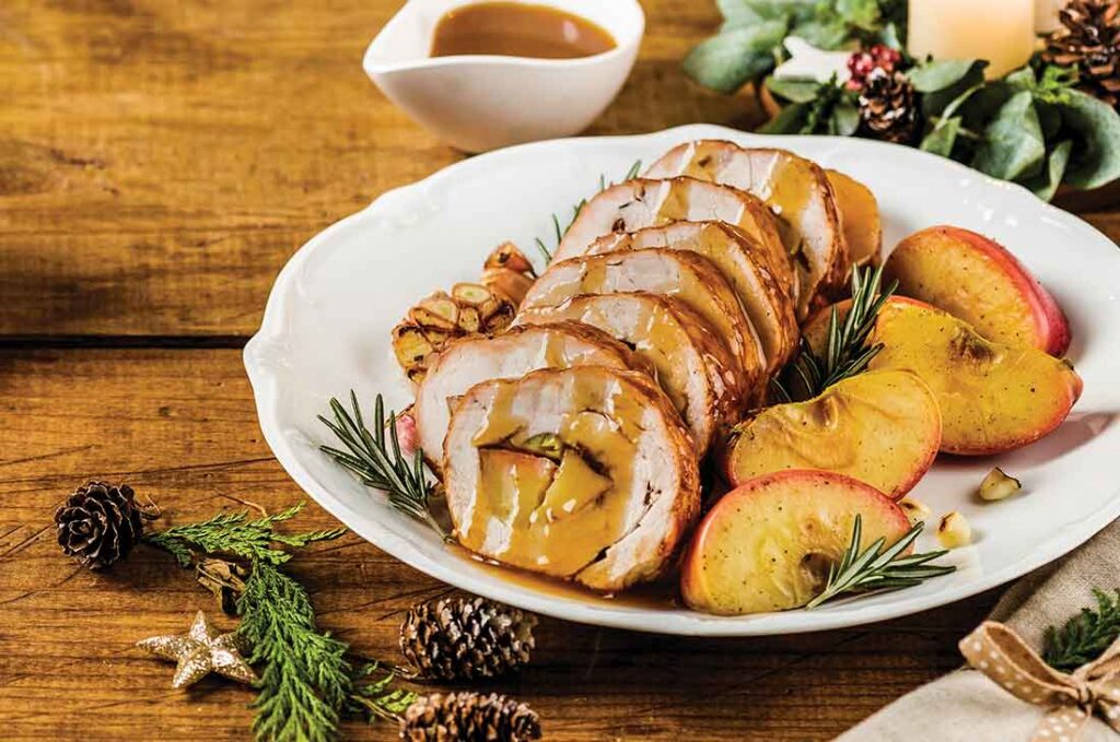 - Poco a poco enrollamos el lomo, con cuidado y despacio para que quede bien apretado, pero sin que se nos salga el relleno. A continuación cubrimos todo el rulo de lomo relleno con tiras de beicon tal y como puedes ver en la imagen, sin dejar ningún hueco sin cubrir.