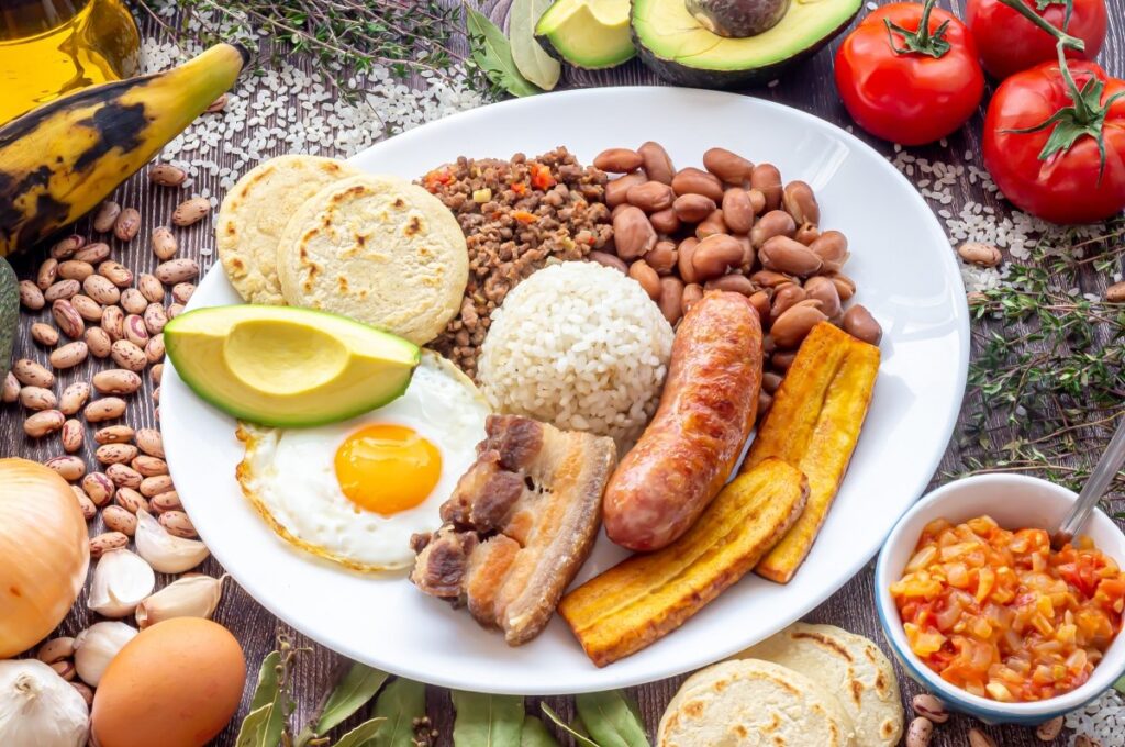 El plato nacional colombiano es la bandeja paisa. Es un plato típico de la región de Antioquia (Medellín) y se compone de carne de res, picadillo, chicharrón, chorizo, frijoles negros, arroz, huevo frito, plátanos, arepas, hogao y aguacate. Como habrás comprendido, este plato es muy completo y está muy bueno.