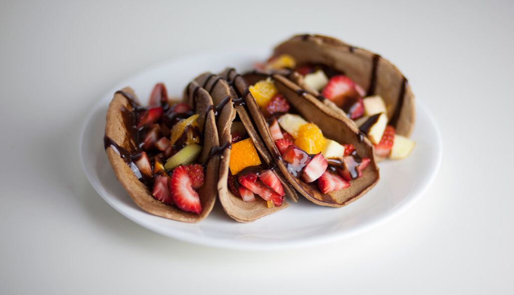 - Cubre cada taco de manera uniforme con las fresas y pedazos de chocolate. Rocía con sirope de chocolate.