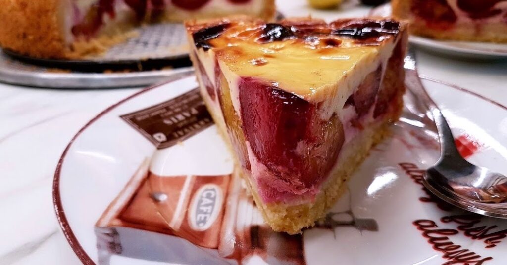 - Transcurrido ese tiempo, introducir también la fuente con las ciruelas. Hornear 30 minutos más o hasta que la superficie de la tarta se empiece a dorar.