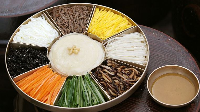 Un​ plato de ⁢fideos ideal ‌para los calurosos ⁣veranos coreanos,⁣ Naengmyeon ‍es un‍ cuenco ​de fideos de⁣ alforfón servidos ⁣en un caldo de hielo ‍picante con pepino ⁢rallado, pera asiática y⁣ huevo⁣ hervido. Fresco, picante y⁤ absolutamente sabroso.