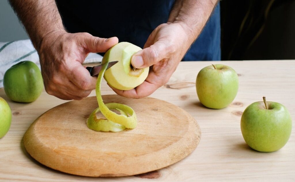 • Agua fría. Una vez pelada y cortada la manzana, se deja en un recipiente con agua fría durante 5 minutos y tapada con papel film para que no salgan los trozos a la superficie. De esta forma, se evita que la manzana entre en contacto con el aire y cambie su color.
