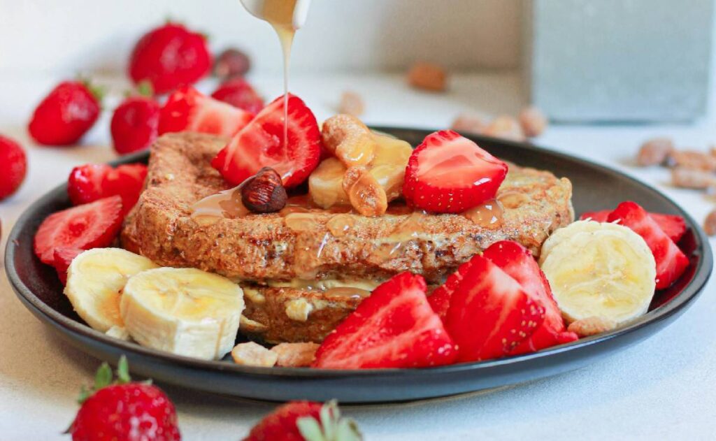 - En un tazón mediano, mezcle los huevos, la leche, la vainilla y el azúcar. Agregue los cubos de pan. Revuelva suavemente hasta humedecer todo el pan con la mezcla del huevo. Cubra con fruta.