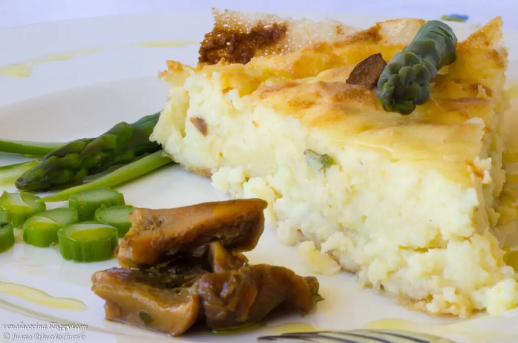 - Cuando las patatas están en su punto, sacarlas a un bol y aplastarlas con un tenedor para formar un puré. Añadir los huevos batidos, la nata (crema de leche), y el queso desmenuzado o en trozos, la sal y la pimienta y remover hasta que esté todo bien integrado. Añadir las setas en este paso.