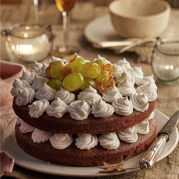 Distribuye la mitad de los merengues sobre un bizcocho, coloca encima el otro bizcocho y añade los merengues restantes. Decora la tarta con un puñadito de uvas caramelizadas.