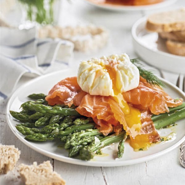 3. Tostamos el pan (opcional) y cuando esté listo, repartimos por encima los huevos revueltos (podemos añadir un poco de pimienta negra, que les queda genial) y encima ponemos el salmón y los espárragos y terminamos con un chorrito de salsa de chile dulce.