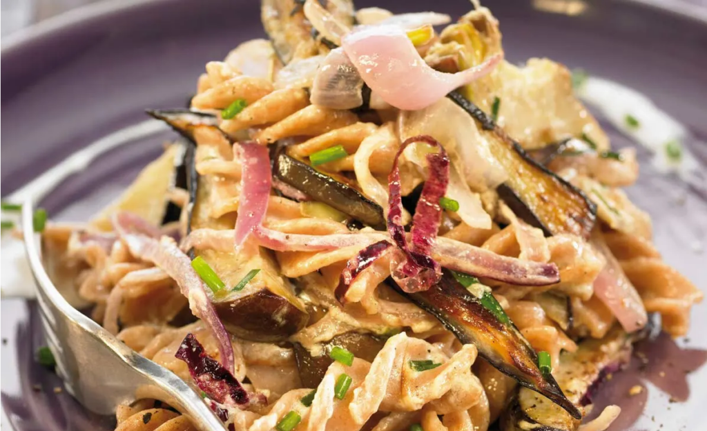 La pasta integral nos aporta muchos beneficios saludables porque tiene menos calorías y es más digestiva, entre otras cosas. Por eso es preferible -sobre todo si la tomas para cenar- a la pasta convencional. Preparamos unos tornillos con berenjenas, alcachofas y cebolla morada, una receta apta para veganos y vegetarianos.