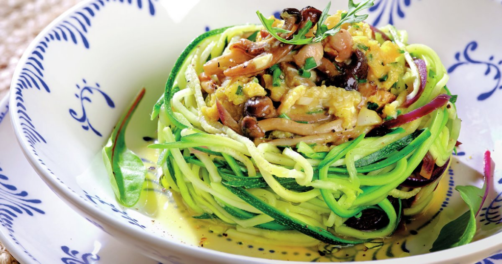 Los espaguetis de calabacín con revuelto de setas son una cena saludable que puede proporcionar una buena cantidad de nutrientes y fibra, mientras se mantiene bajo en calorías y carbohidratos.