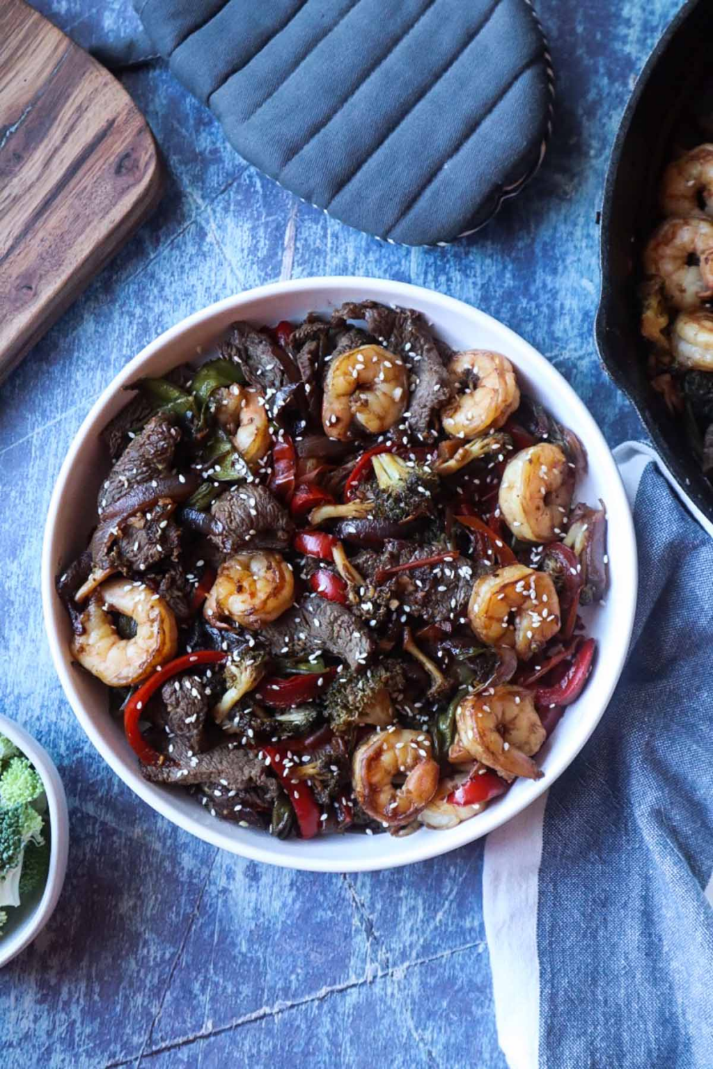 Explora la simplicidad de un salteado de filete y camarones: proteínas jugosas, verduras vibrantes y sabores intensos, todo ello salteado a la perfección.