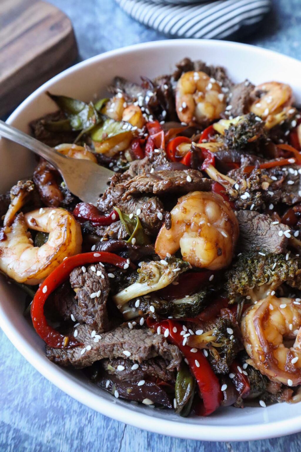 Explora la simplicidad de un salteado de filete y camarones: proteínas jugosas, verduras vibrantes y sabores intensos, todo ello salteado a la perfección.