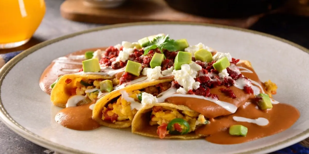 - Rellena las tortillas con el huevo, sirve en un plato y baña con la salsa de frijol caliente. Sirve con queso, Media Crema y aguacate; ofrece al momento.