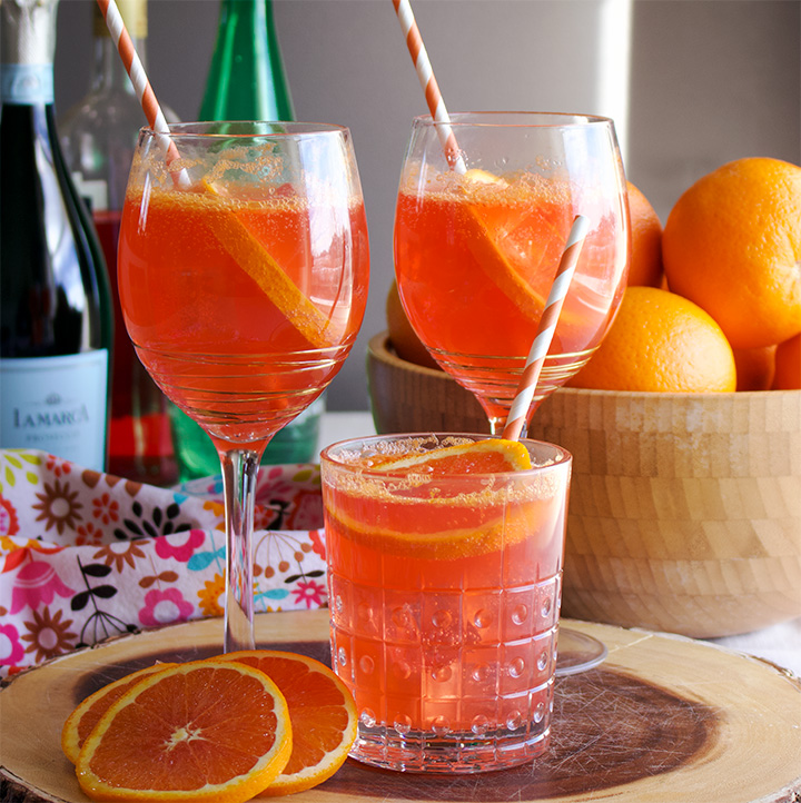 Similar al St. Germain, con un toque extra de intensidad, el Aperol Spritz se sirve con Prosecco, Aperol, un chorrito de soda y una rodaja de naranja. Si no conoces el singular aperitivo italiano  llamado Aperol, no eres el único, ya que no es muy común en los hogares estadounidenses. En esencia, es un licor agridulce elaborado con ruibarbo, raíz de genciana y corteza de quina. Le da un toque delicioso a este refrescante cóctel a base de vino.