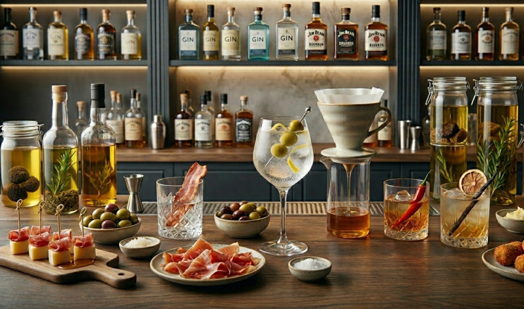 Imaginen un Bourbon con el aroma ahumado y salado del bacon crujiente, o una Ginebra con la untuosidad y el frescor herbal de un aceite de oliva virgen extra de cosecha temprana. No se trata de un aderezo flotando en la copa; es una integración molecular que cambia las reglas del juego líquido.