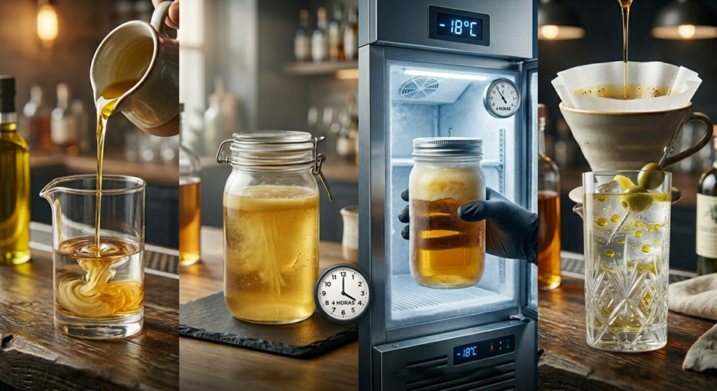 - La Fusión: Se mezcla un destilado (Bourbon, Ron, Vodka, Ginebra) con una grasa líquida (mantequilla avellanada, aceite de coco, grasa de pato, o incluso queso fundido) a temperatura ambiente o ligeramente tibia.