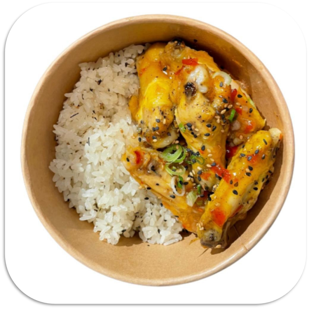 - Sirve las alas sobre el arroz con vegetales, agrega semillas de ajonjolí y la salsa por encima.