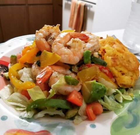 la ensalada incluye una variedad de vegetales y el mango, que son ricos en vitaminas.